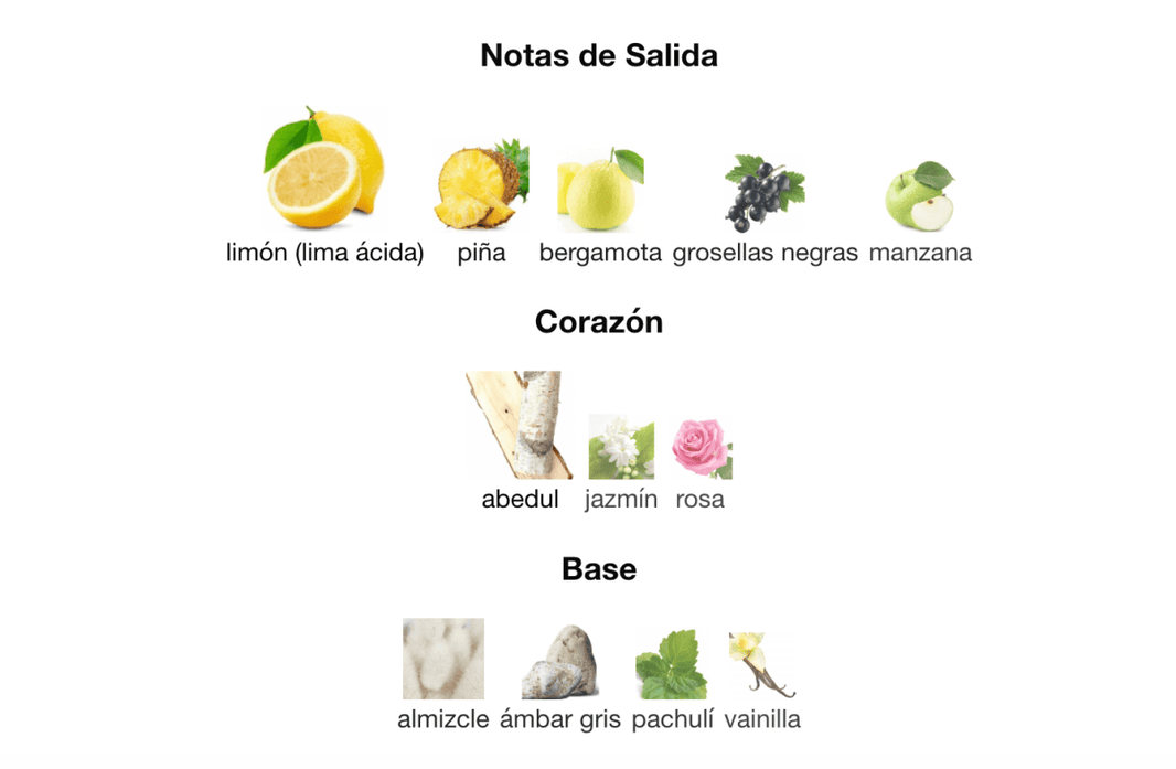 Salida: Limón (lima ácida), piña, bergamota, grosellas negras y manzana.